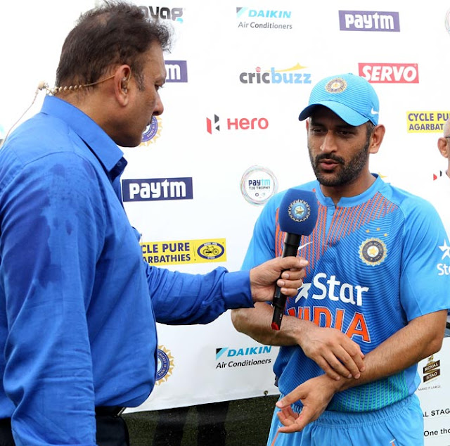 India captain Mahendra Singh Dhoni, right, speaks to Ravi Shastri after the first T20 International