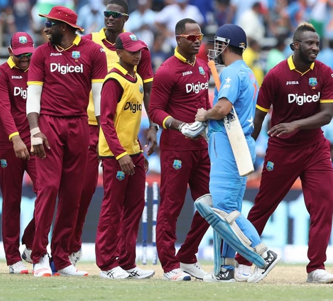 India's Mahendra Singh Dhoni congratulates West Indies' players