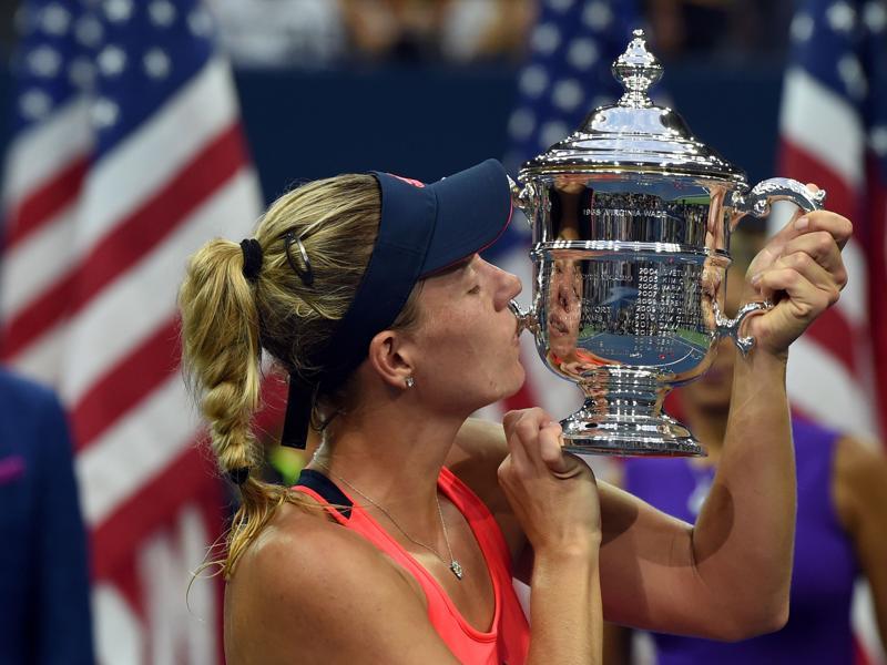 Angelique Kerber of Germany holds up her winning trophy after defeating Karolina Pliskova of Czech Republic in the 2016 US Open women’s Singles final match at the USTA Billie Jean King National Tennis Center in New York on September 10, 2016. New world number one Kerber won with a battling 6-3, 4-6, 6-4 victory over Pliskova. (AFP)