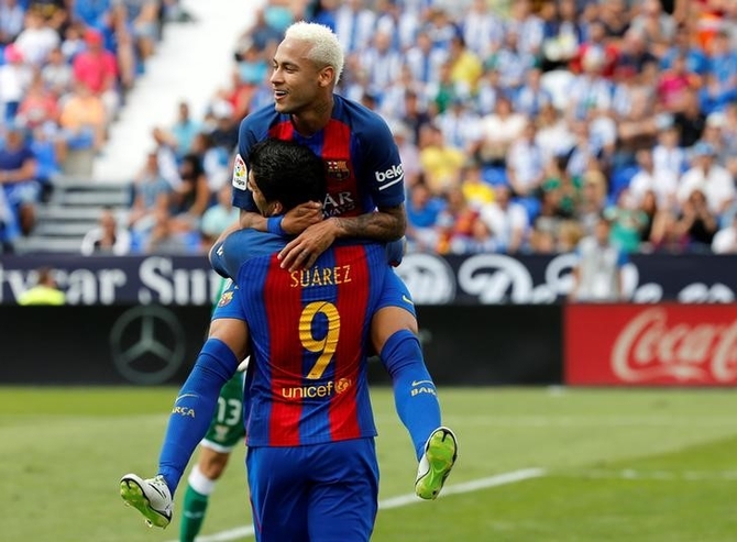 Barcelona's attacking trio of Lionel Messi, Luis Suarez and Neymar were all on target as the champions roared back into life in La Liga with a dominant 5-1 victory at promoted Leganes on Saturday.