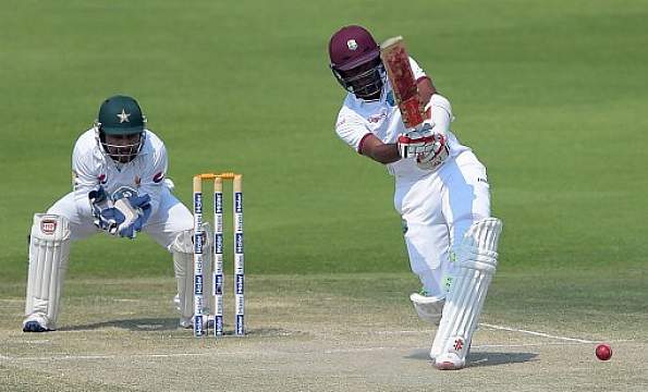 After Pakistan eventually declared their second innings at 227 for 2 during the Lunch break to set an imposing target, Brathwaite batted without theatrics. However, he lost his partner Leon Johnson (9) to an ill-advised sweep shot off Yasir Shah in the eighth over.